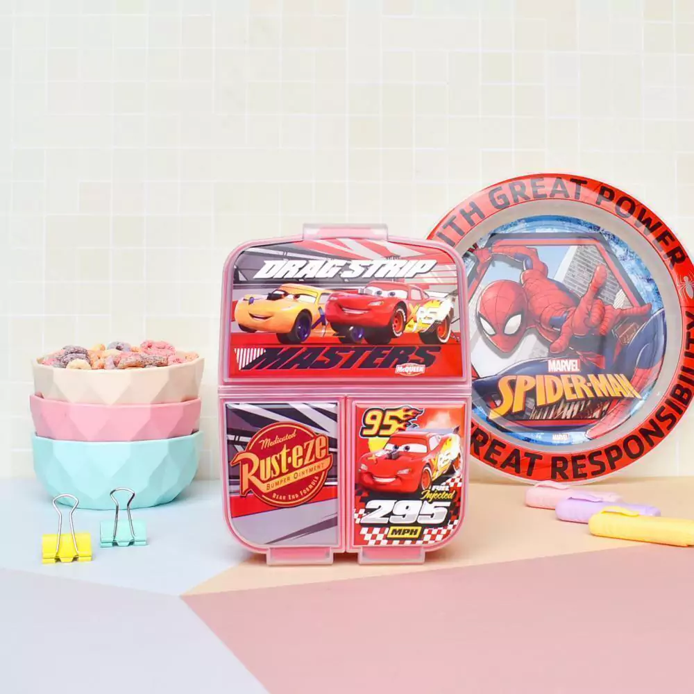 ¡El compañero ideal para los más chicos! Este hermético plástico cuenta con divisiones para que puedan llevar su comida favorita sin mezclar sabores. Las tapas tienen trabas, asegurando que no se derrame nada. Además, está estampado con un montón de personajes que les encantarán! 🎉
